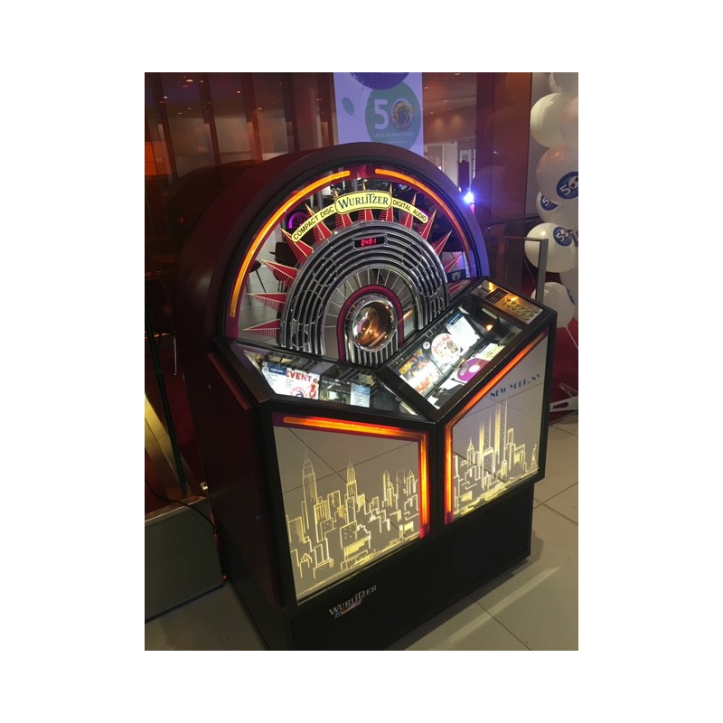 En s'appuyant sur le design de la tour Chrysler à NEW YORK, Wurltzer a crée dans les années 90 une trés belle machine pouvant accueuillir 100 cd. Les tubes à bulle complétent le design élégant ainsi que le porte étiquettes rotatif qui permet de mettre en valeur les pochettes cd.