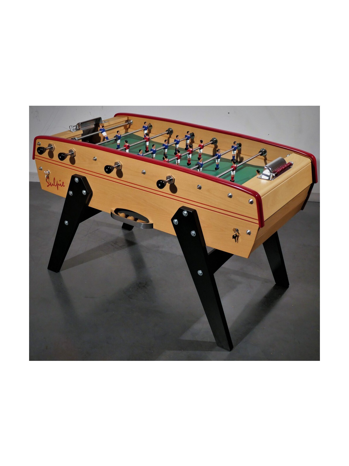 Chaque baby-foot Sulpie est entièrement fabriquée à la main par des artisans expérimentés, selon des procédés mêlant tradition et innovation. L’entreprise privilégie des matériaux nobles, tels que le hêtre massif pour la structure et l’acier chromé pour les barres, garantissant solidité, qualité et durabilité.