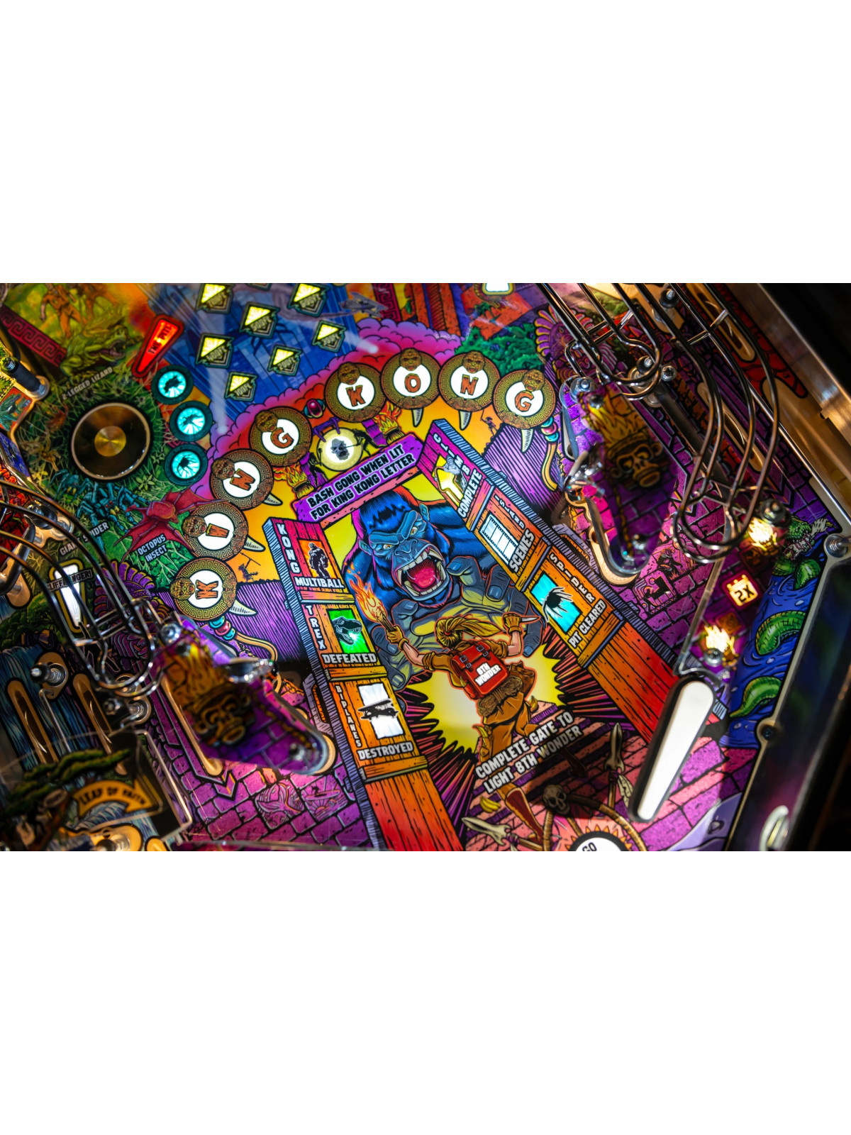 Le plateau de jeu intègre plusieurs éléments interactifs majeurs, dont des rampes complexes, des cibles tombantes, un kicker vertical, des zones de tir dédiées et quatre batteurs permettant un contrôle précis de la bille. Une sculpture animée de King Kong, dotée de mouvements synchronisés, renforce l’immersion en déclenchant des séquences de jeu avancées, notamment les modes multibilles.