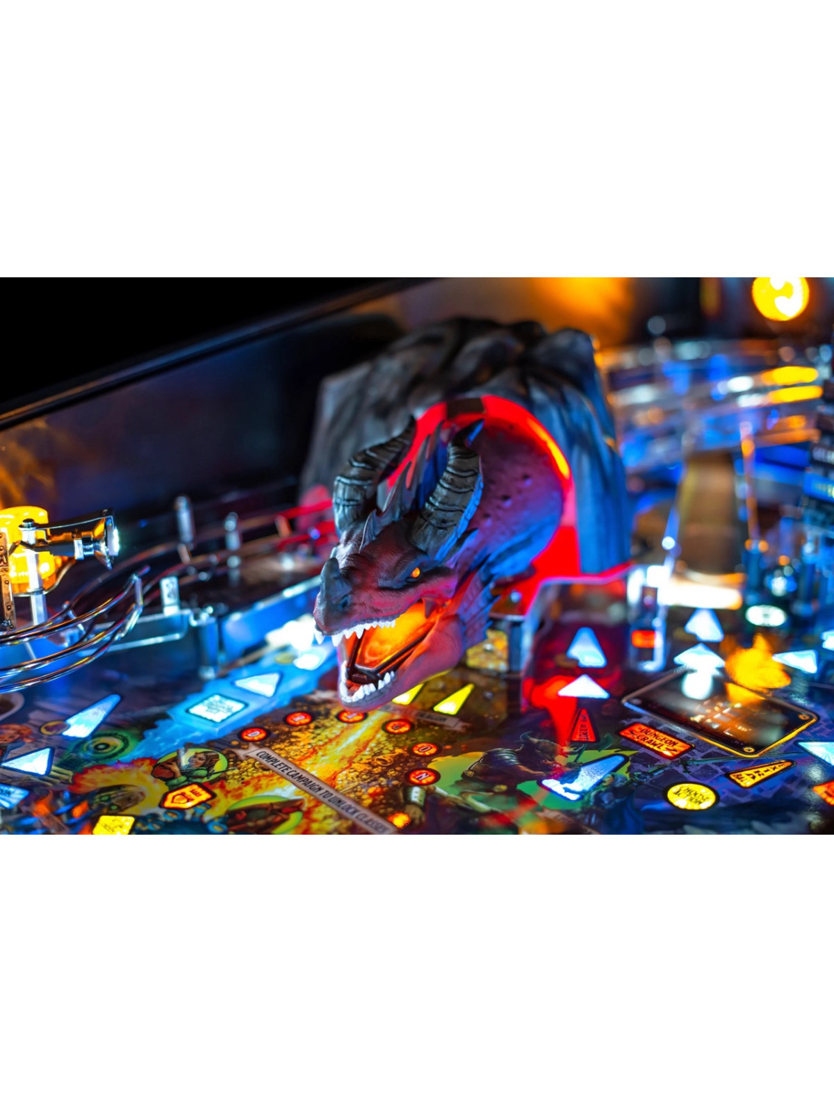 Le plateau de jeu se distingue par une grande richesse mécanique : rampes complexes, cibles multiples, mécanismes interactifs, modes de quêtes et multiballs scénarisés. Une figurine animée de dragon, capable de mouvements précis et d’effets lumineux, constitue l’élément central du dispositif, renforçant l’immersion à chaque séquence de jeu. Les versions Pro, Premium et Limited Edition proposent chacune des niveaux de finition spécifiques, incluant illustrations exclusives, décors supplémentaires et détails techniques renforcés.