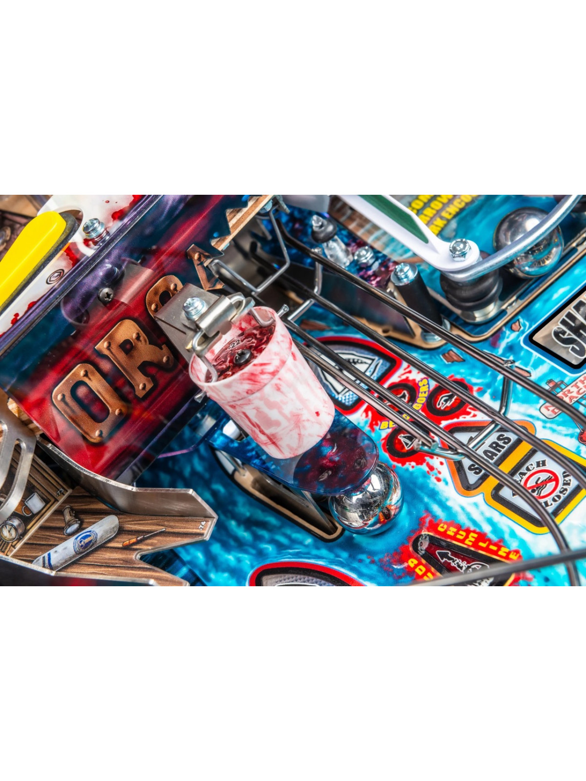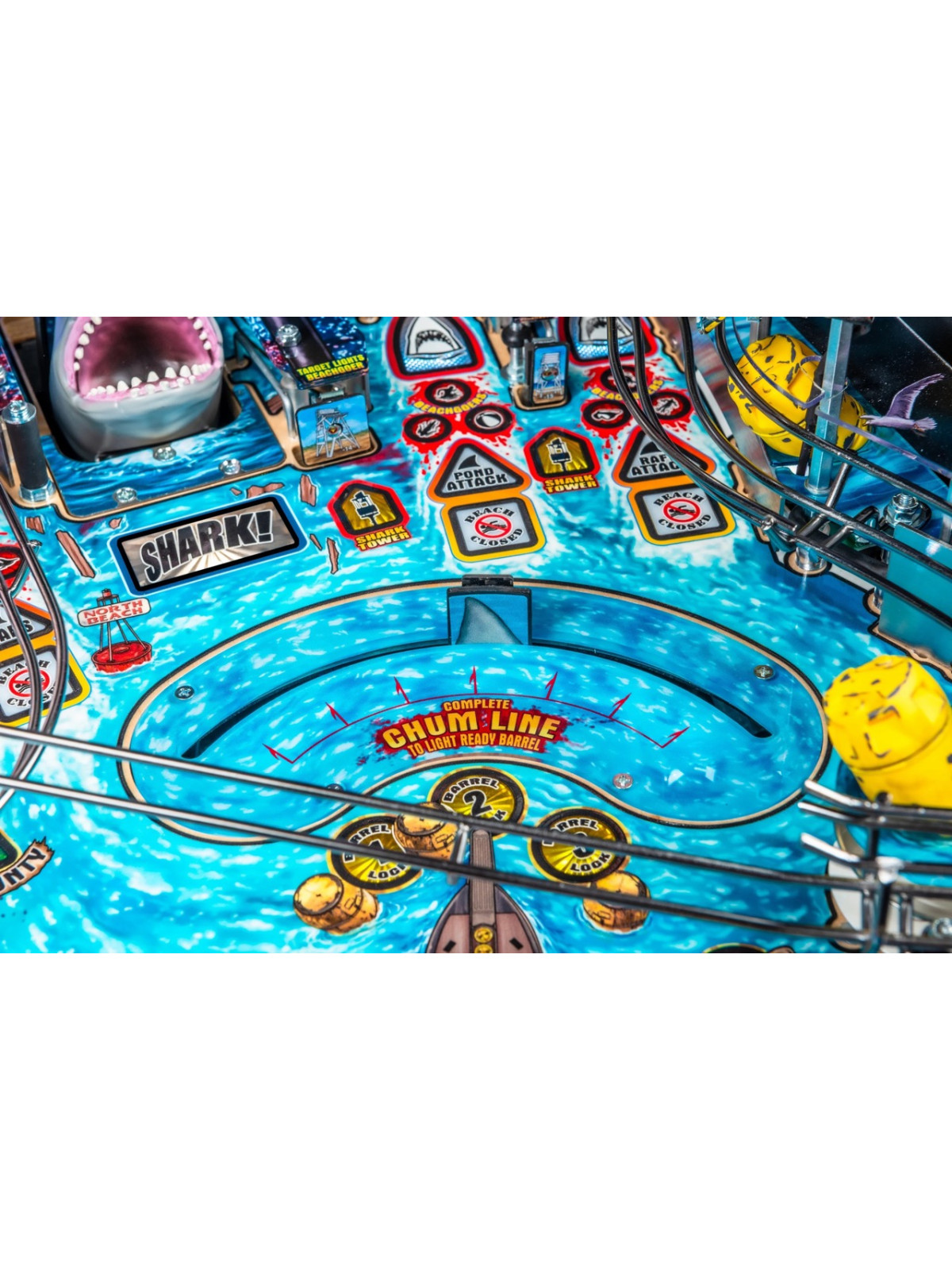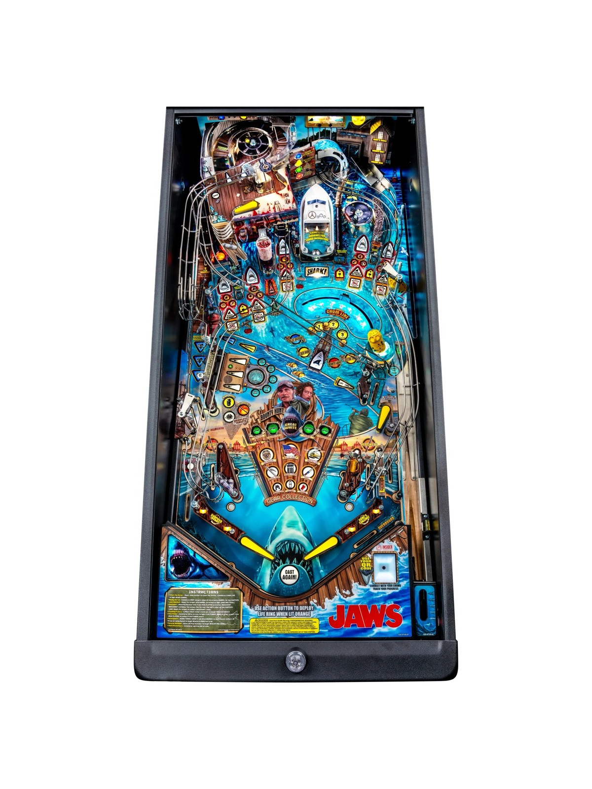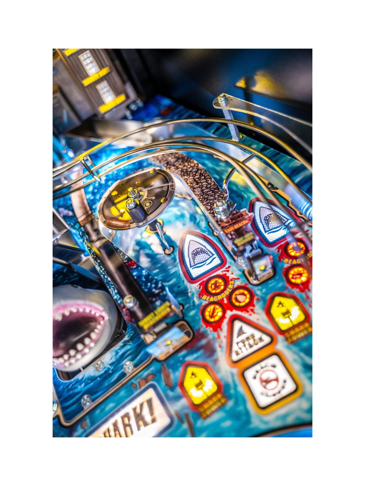 Le plateau de jeu se distingue par une architecture particulièrement dynamique : rampes métalliques rapides, cibles tombantes, spinners, zones thématiques inspirées de l’île d’Amity et mécanisme motorisé représentant la nageoire du requin. Des modes narratifs et multibilles s’appuient sur les scènes emblématiques du film, offrant une progression fluide, variée et dotée d’une forte rejouabilité. Les versions Premium et Limited Edition enrichissent l’immersion grâce à des éléments mécaniques supplémentaires, des décors améliorés et des séquences visuelles renforcées.