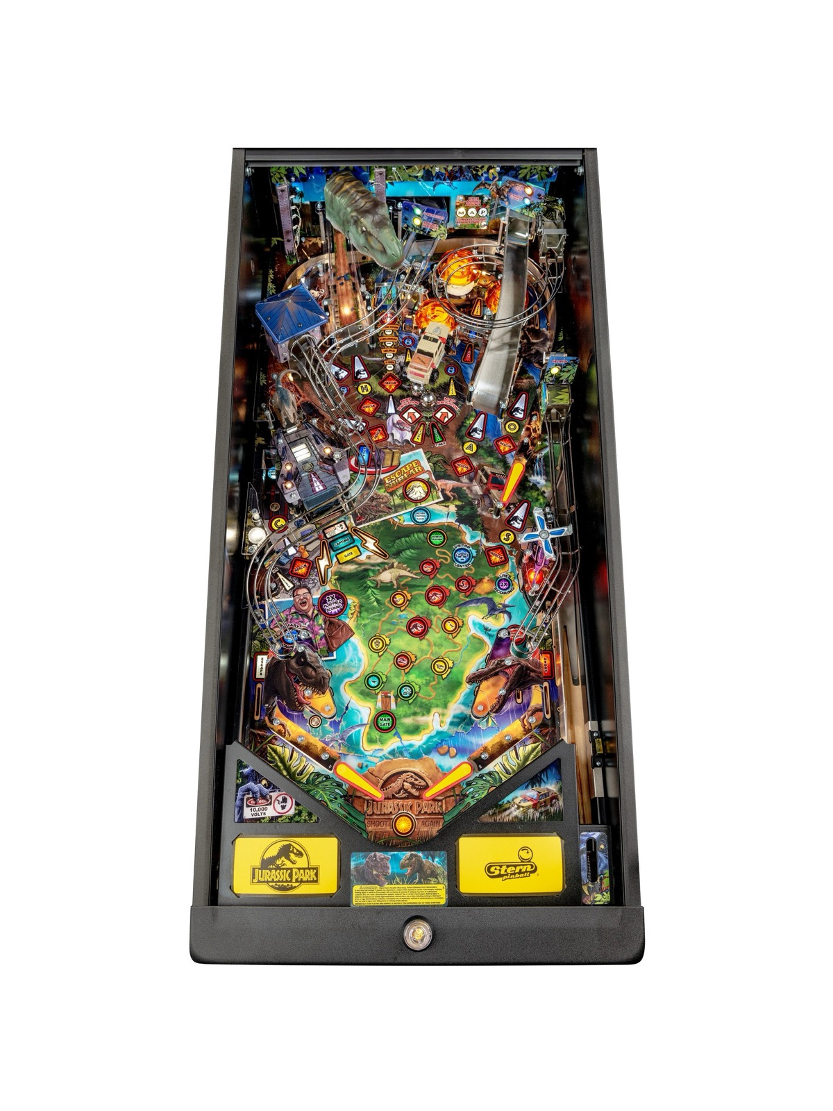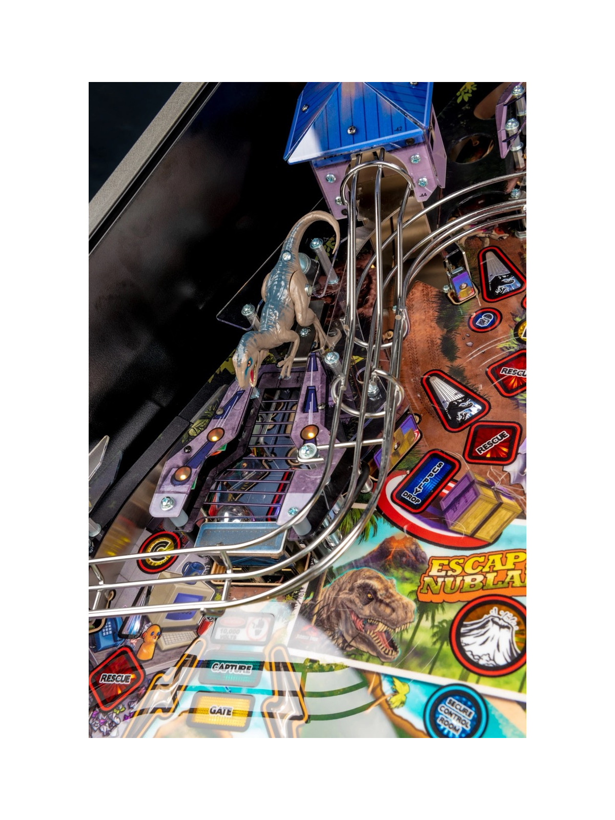 Le plateau se distingue par une architecture dynamique comprenant rampes rapides, cibles multiples, spinners, zones interactives et séquences scénarisées reprenant les moments clés de l’univers Jurassic Park. Les missions, modélisées autour de la capture des dinosaures, offrent une progression riche et une forte rejouabilité. Dans les versions Premium et Limited Edition, des éléments mécaniques additionnels, comme un T-Rex motorisé capable d’attraper la bille, renforcent encore l’immersion et l’impact visuel.