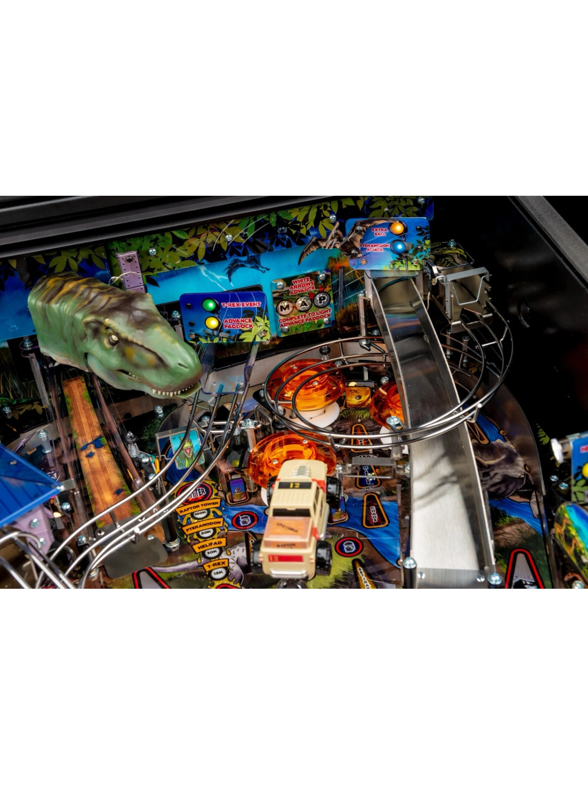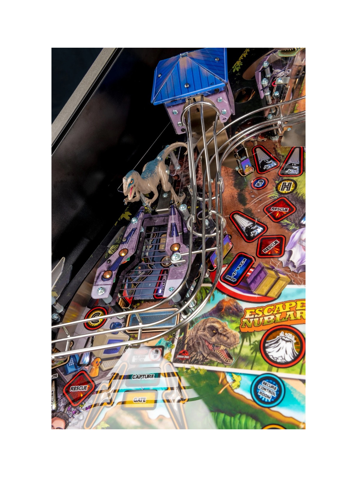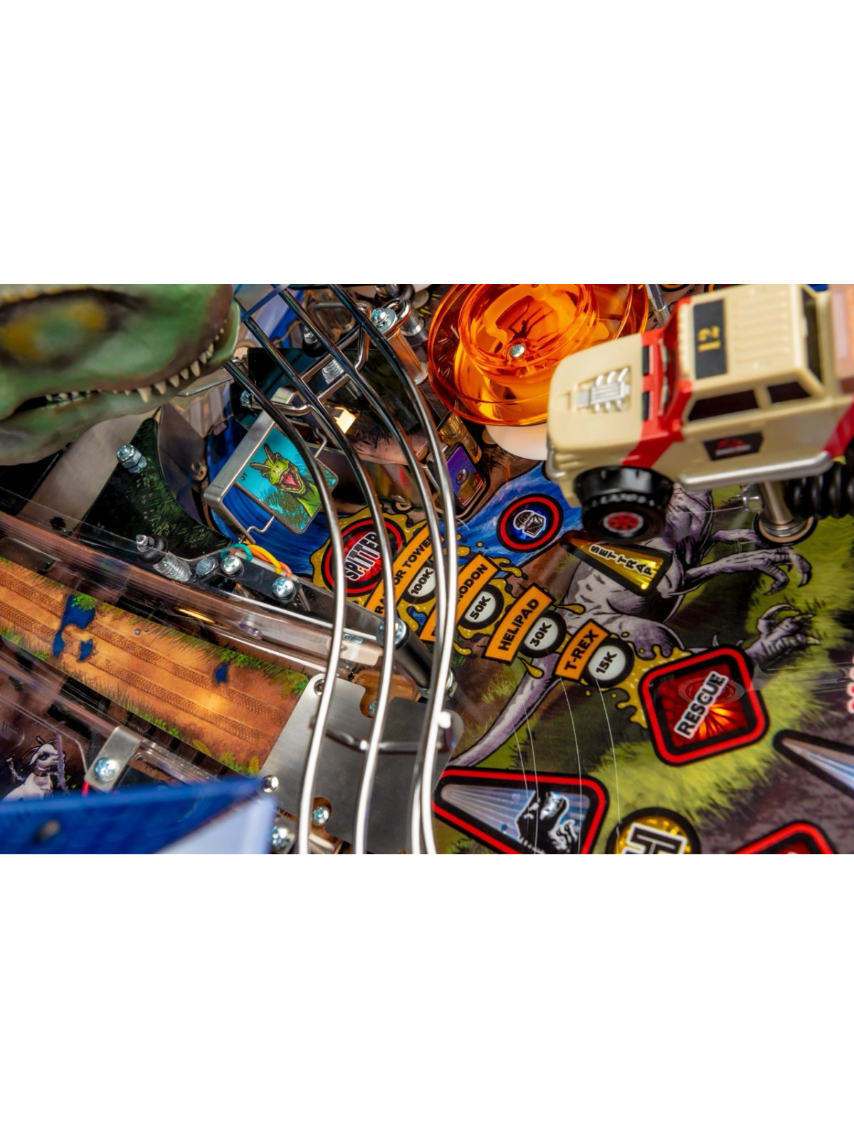 Le plateau se distingue par une architecture dynamique comprenant rampes rapides, cibles multiples, spinners, zones interactives et séquences scénarisées reprenant les moments clés de l’univers Jurassic Park. Les missions, modélisées autour de la capture des dinosaures, offrent une progression riche et une forte rejouabilité. Dans les versions Premium et Limited Edition, des éléments mécaniques additionnels, comme un T-Rex motorisé capable d’attraper la bille, renforcent encore l’immersion et l’impact visuel.