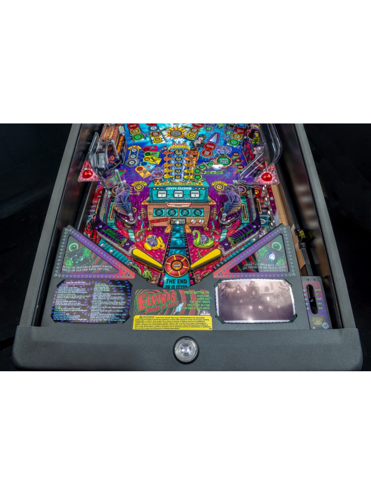 Le plateau de jeu présente une architecture riche intégrant rampes rapides, cibles multiples, spinners, lock mécaniques et zones dédiées aux différents « films » fictifs mettant en scène Elvira. Les versions Premium et Limited Edition incluent des fonctionnalités exclusives telles que la maison hantée animée, le gargouille kicker ou encore des décors plus détaillés, renforçant la dimension cinématographique et immersive du flipper. Les modes narratifs permettent de progresser à travers des séquences humoristiques, des scènes inspirées de films d’horreur classiques et des objectifs variés offrant une forte rejouabilité.