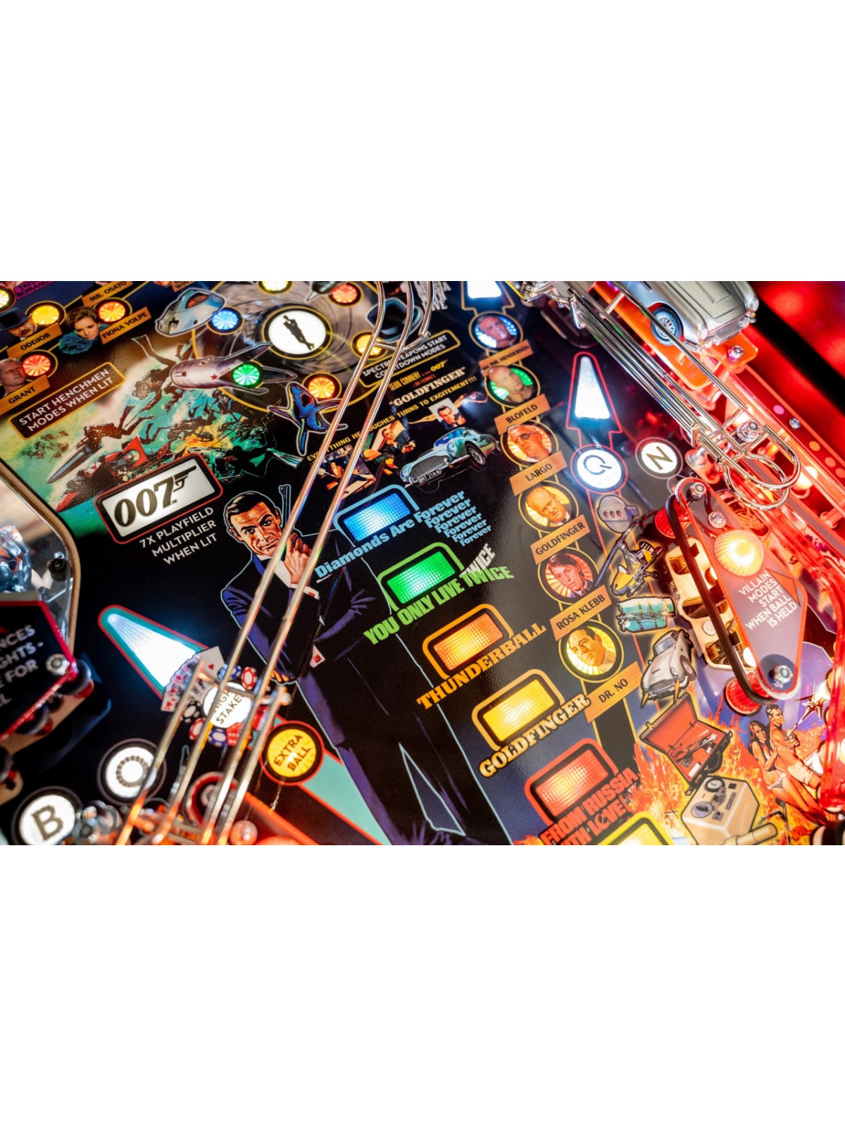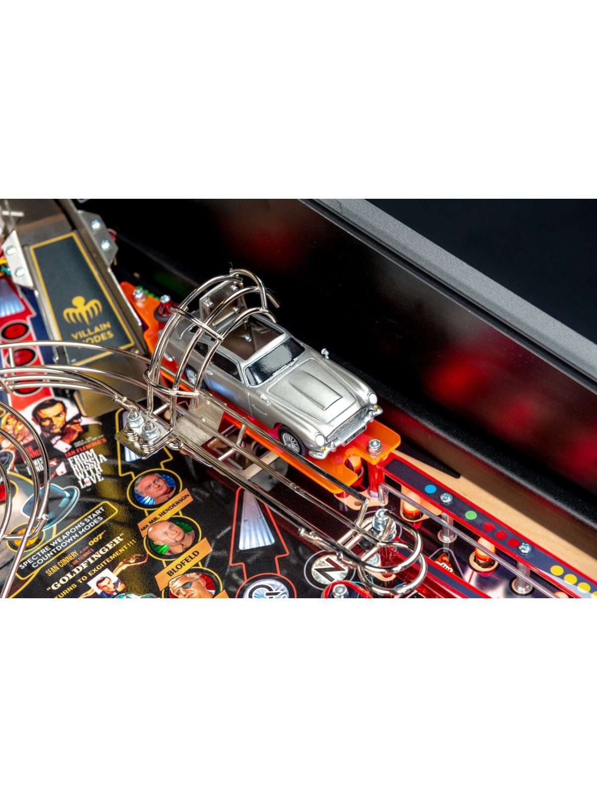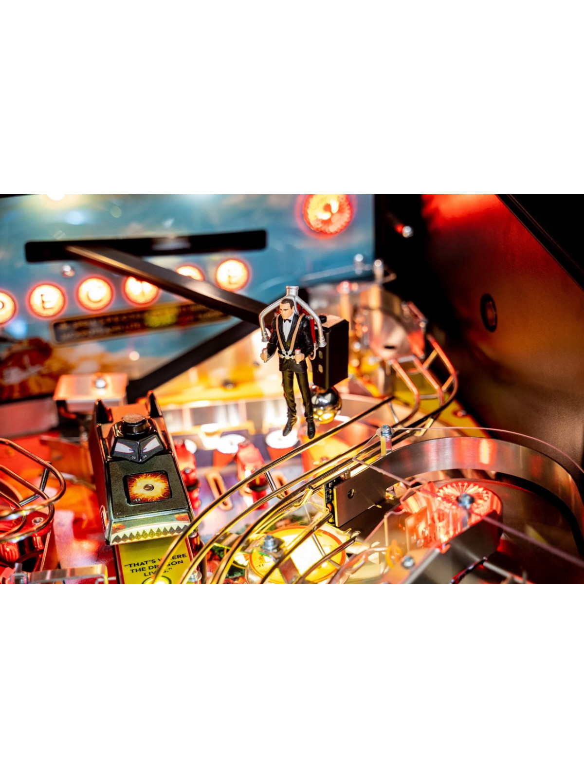 Le plateau de jeu intègre des rampes rapides, des mécanismes interactifs inspirés des gadgets emblématiques, des cibles multiples et des séquences scénarisées reprenant des scènes issues des films avec Sean Connery. Modes narratifs, multibilles thématiques et missions progressives assurent une rejouabilité élevée et une dynamique de jeu fluide. Les versions Premium et Limited Edition bénéficient de décors renforcés, d’animations supplémentaires et de mécaniques avancées, offrant une immersion encore plus poussée.