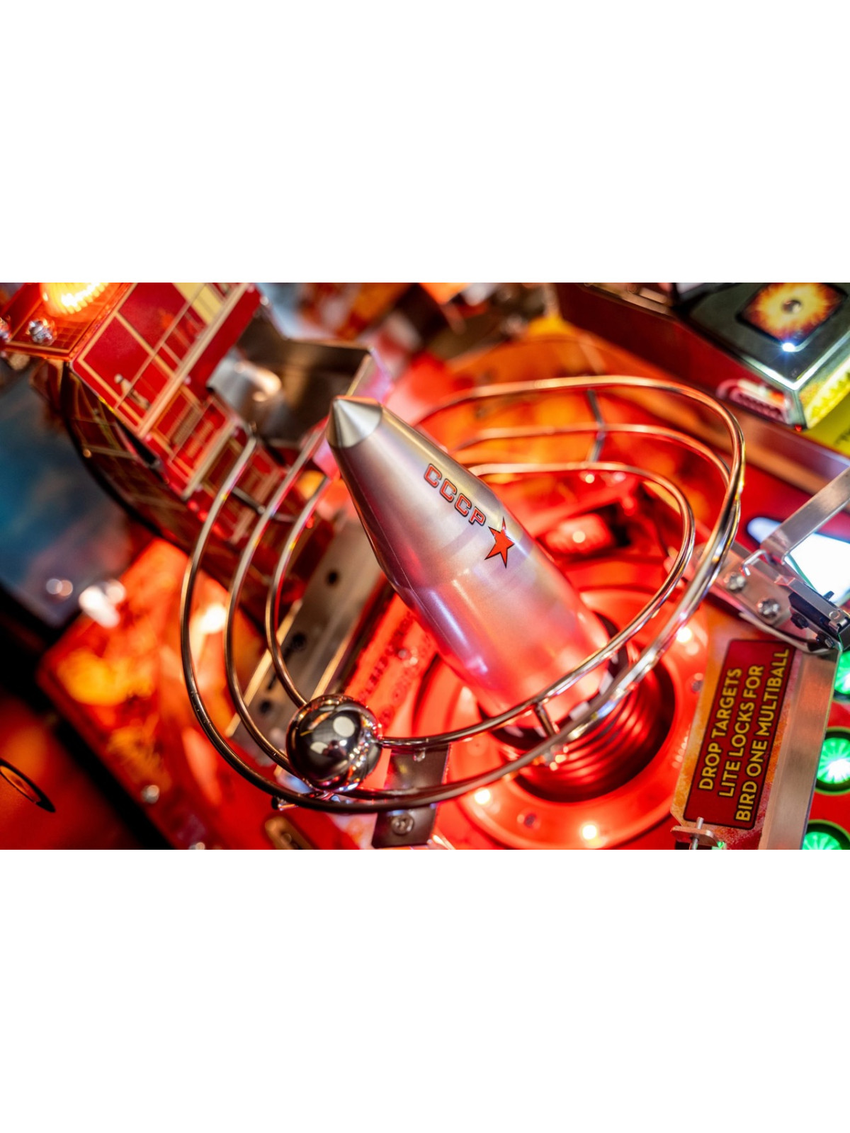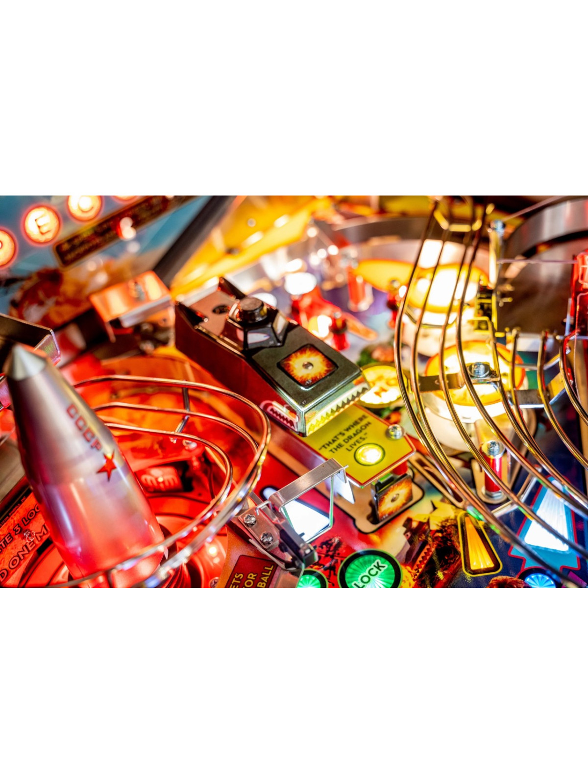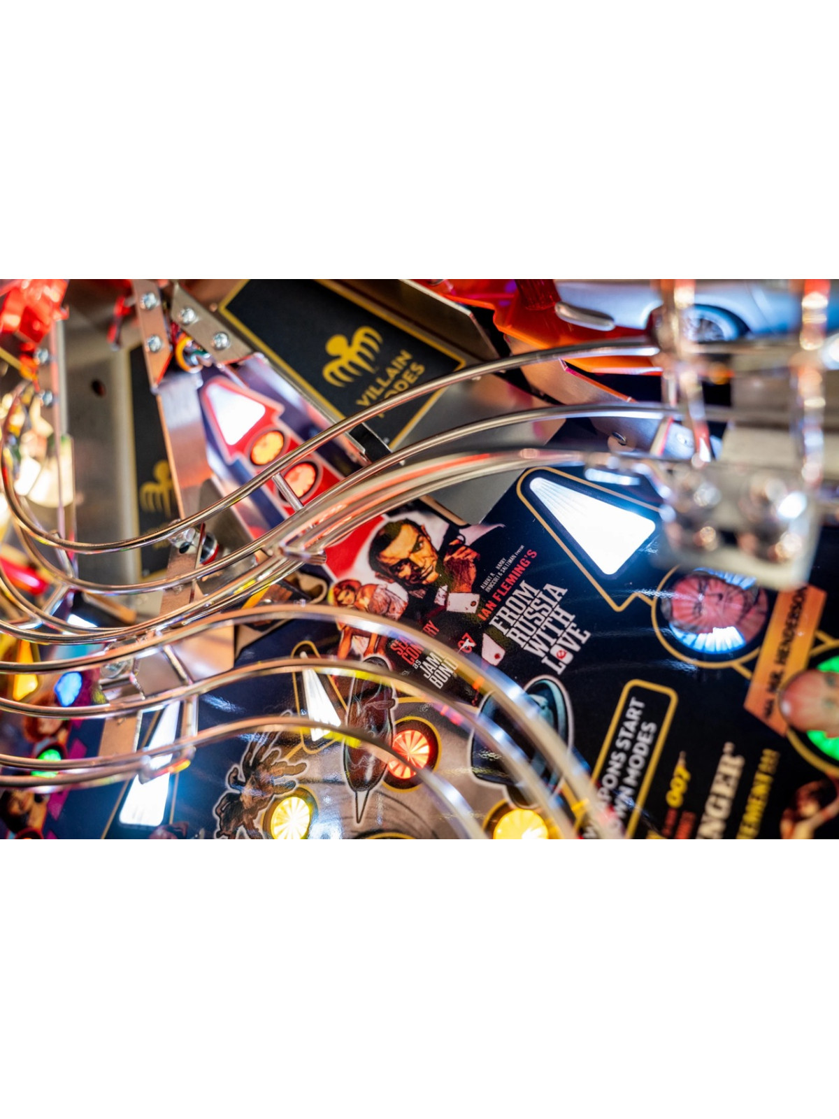 Le plateau de jeu intègre des rampes rapides, des mécanismes interactifs inspirés des gadgets emblématiques, des cibles multiples et des séquences scénarisées reprenant des scènes issues des films avec Sean Connery. Modes narratifs, multibilles thématiques et missions progressives assurent une rejouabilité élevée et une dynamique de jeu fluide. Les versions Premium et Limited Edition bénéficient de décors renforcés, d’animations supplémentaires et de mécaniques avancées, offrant une immersion encore plus poussée.