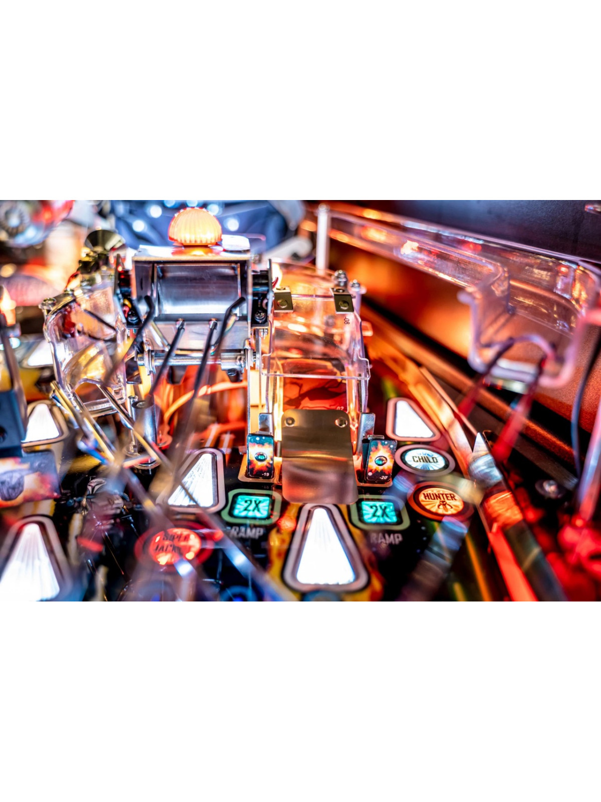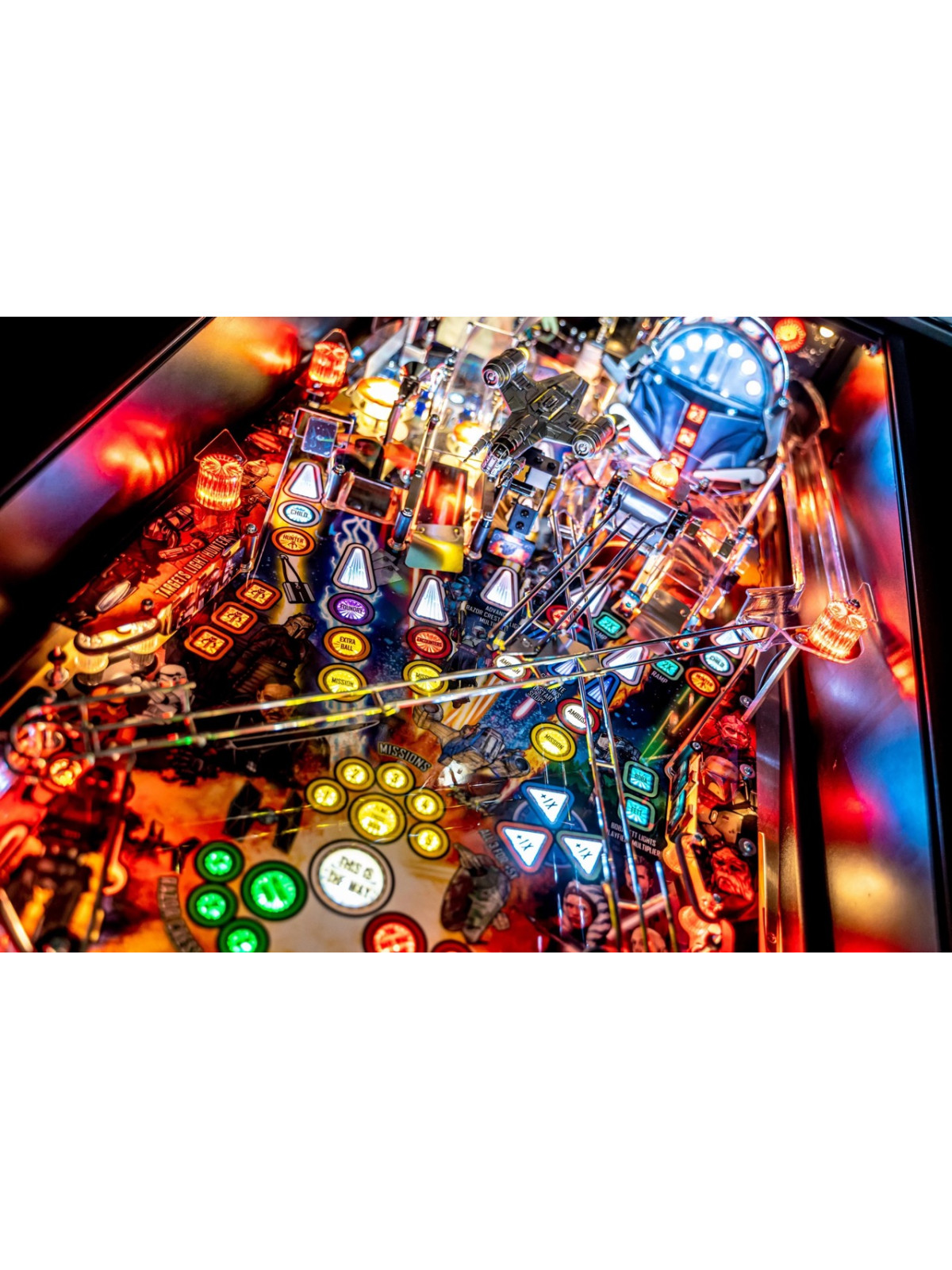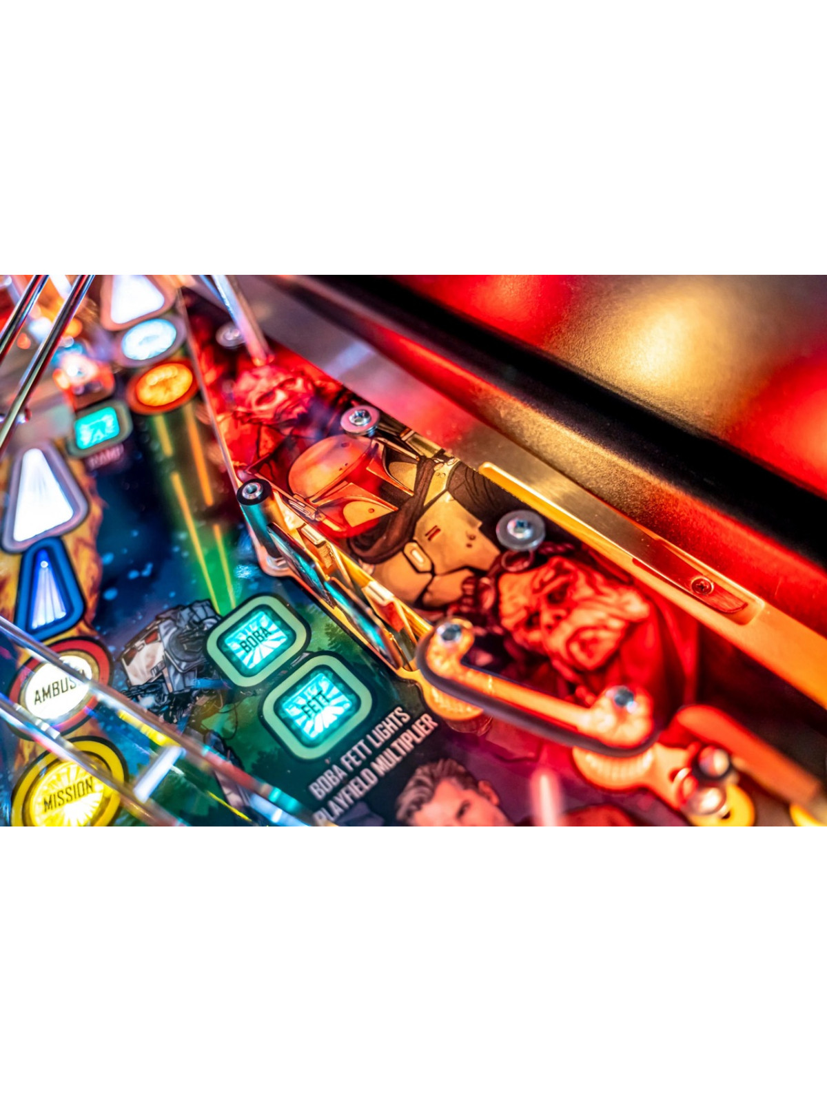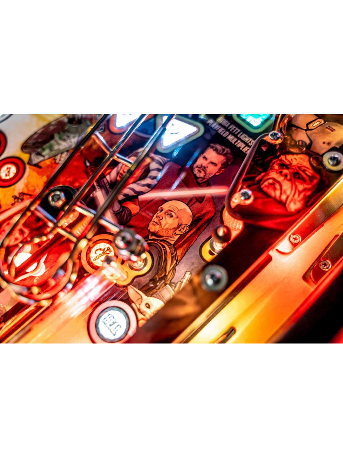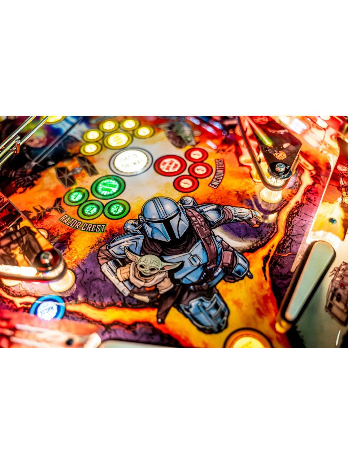 Le plateau se distingue par une architecture riche en interactions : rampes rapides, mini-plateau supérieur inspiré de « The Razor Crest », cibles mécaniques, modes scénarisés et multibilles thématiques. Les missions s’articulent autour des épisodes emblématiques de la série, offrant une progression cohérente et une forte rejouabilité. Dans les versions Premium et Limited Edition, des éléments mécaniques exclusifs — tels que des mouvements supplémentaires du Razor Crest et des décors enrichis — renforcent l’impact visuel et l’immersion.