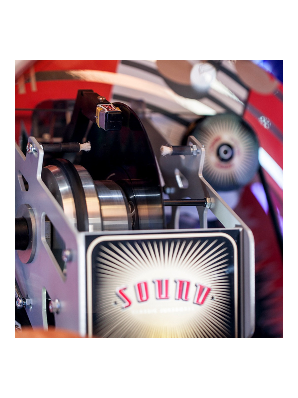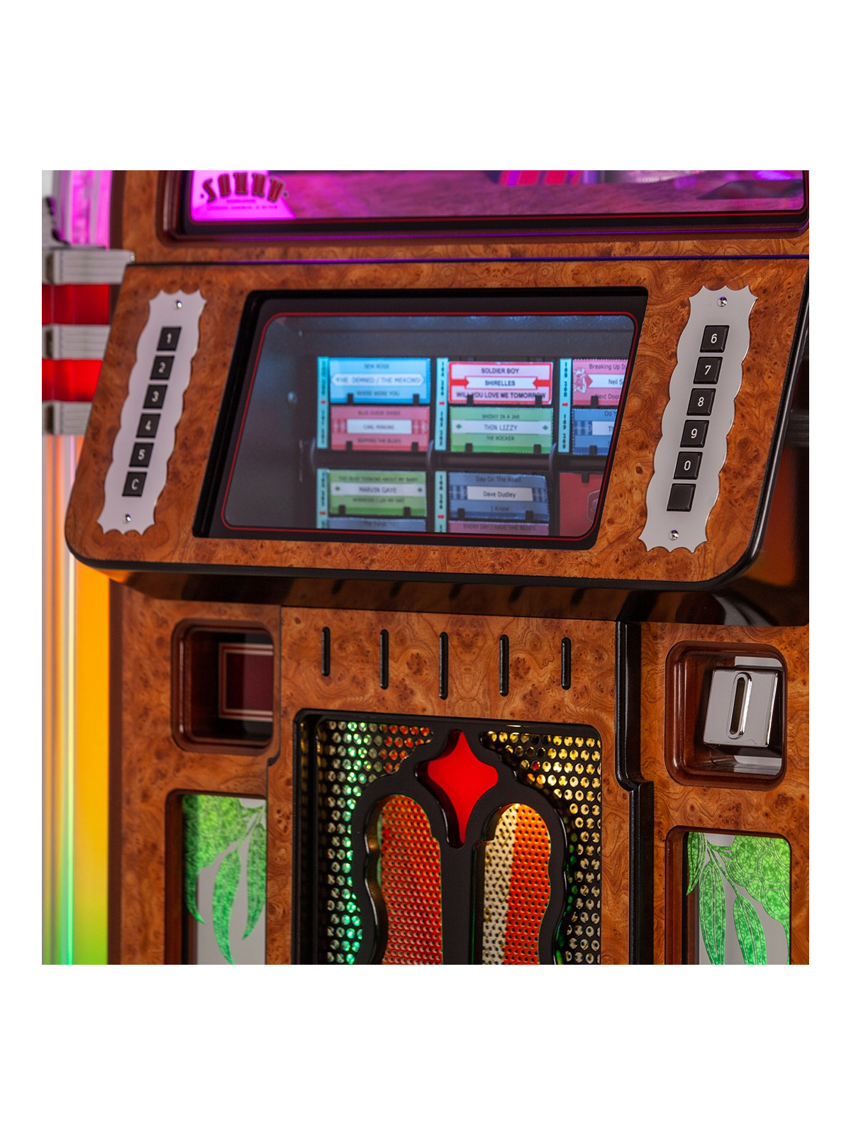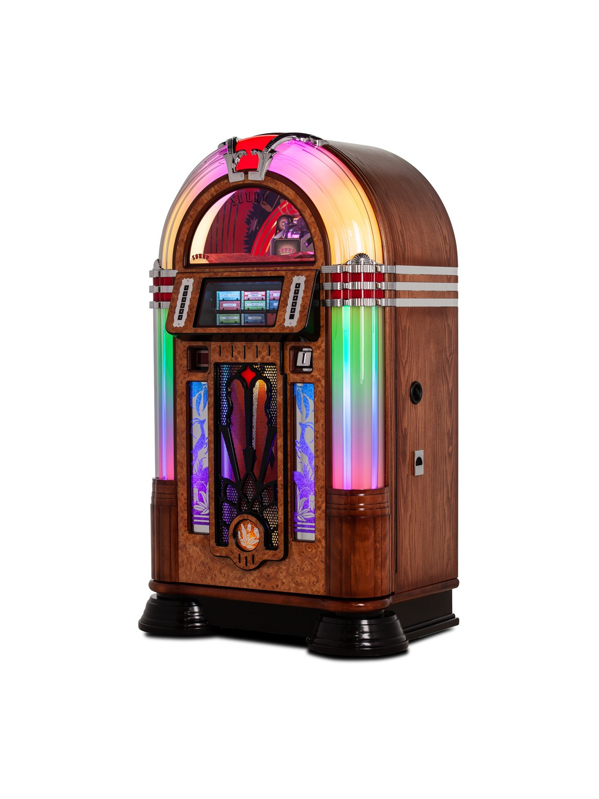 Son meuble en bois massif d’une seule pièce est orné d’éléments en aluminium/zinc chromés et de tubes à bulles protégés par des capots en polycarbonate, le même matériau que les boucliers anti-émeute, garantissant robustesse et longévité. Les finitions et placages sont personnalisables, permettant d’adapter le jukebox à tous les styles d’intérieurs : bar, hôtel, salon privé ou salle de jeux.