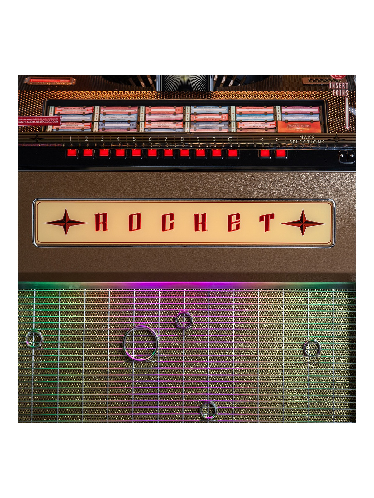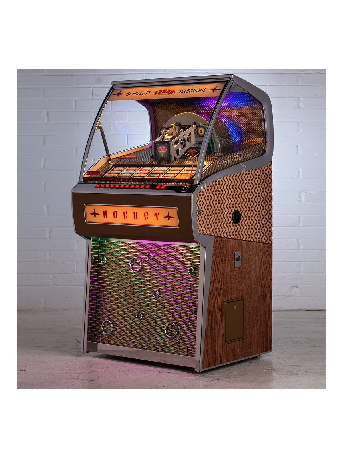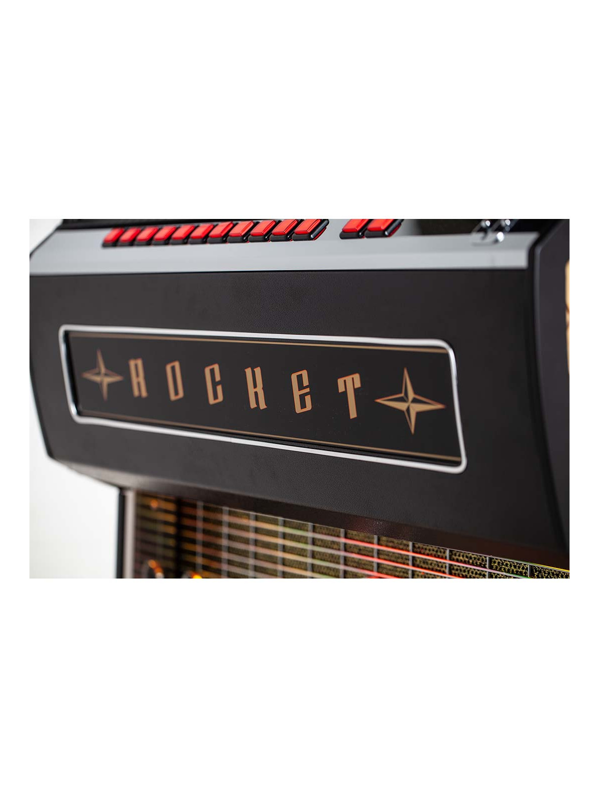 Fabriqué entièrement à la main au Royaume-Uni, le Rocket Vinyle bénéficie d’un meuble en bois massif, de finitions premium et d’éléments décoratifs soigneusement travaillés. Chaque détail reflète le savoir-faire historique de Sound Leisure, reconnu mondialement pour la qualité, la fiabilité et la longévité de ses jukebox.