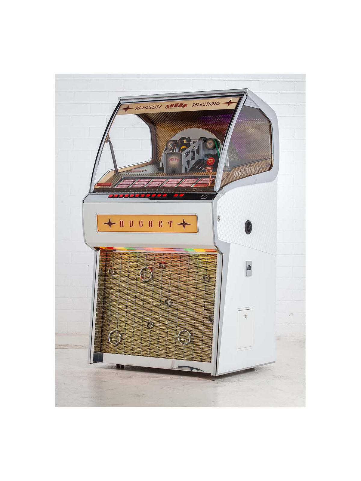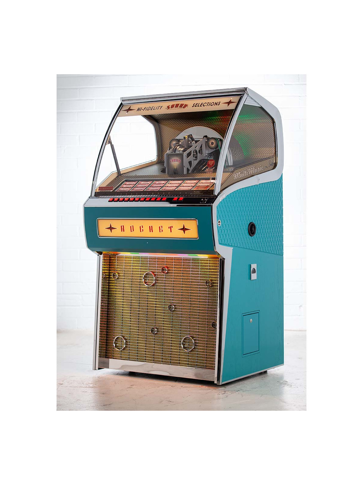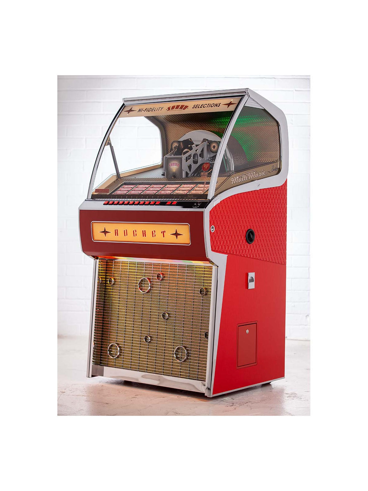 Le Jukebox Rocket 45 tours est l’un des modèles emblématiques de Sound Leisure, combinant un design rétro spectaculaire, une fabrication artisanale haut de gamme et le plaisir intemporel du vinyle. Avec ses lignes audacieuses inspirées des jukebox classiques et son esthétique affirmée, il s’impose comme une véritable pièce maîtresse décorative, aussi impressionnante visuellement que performante sur le plan musical.