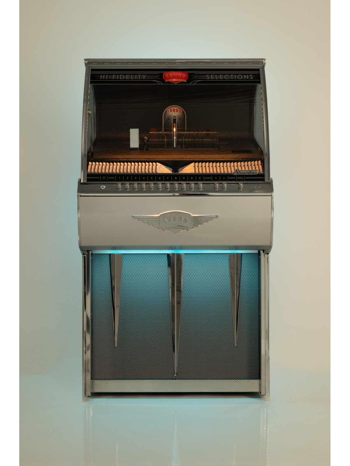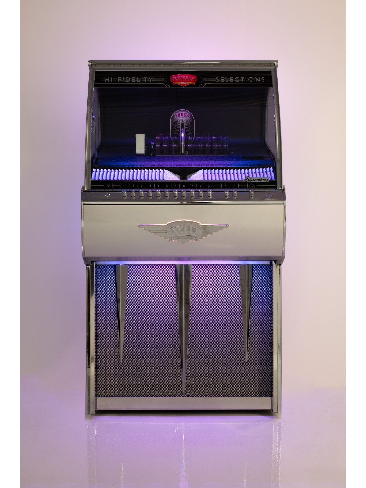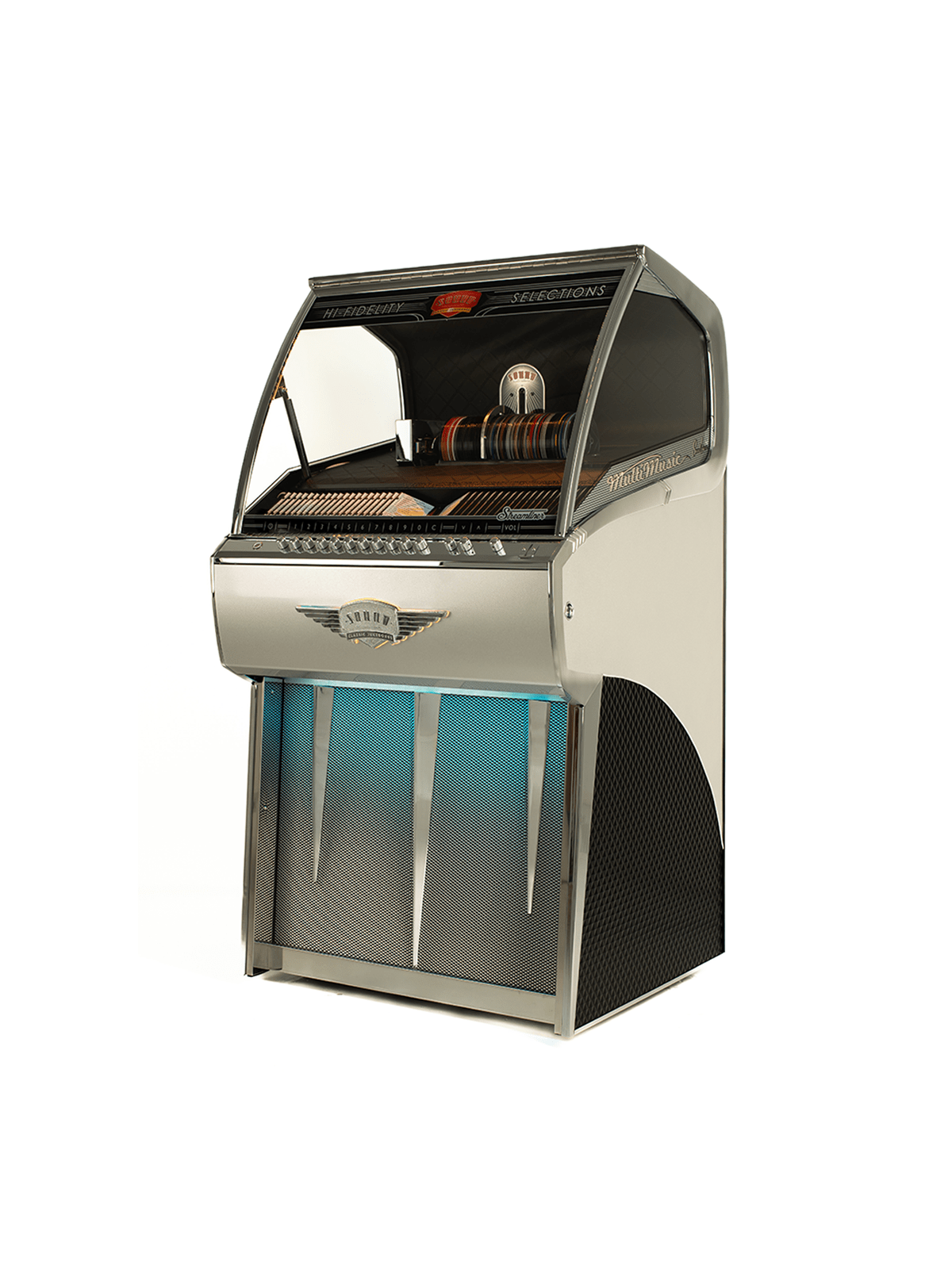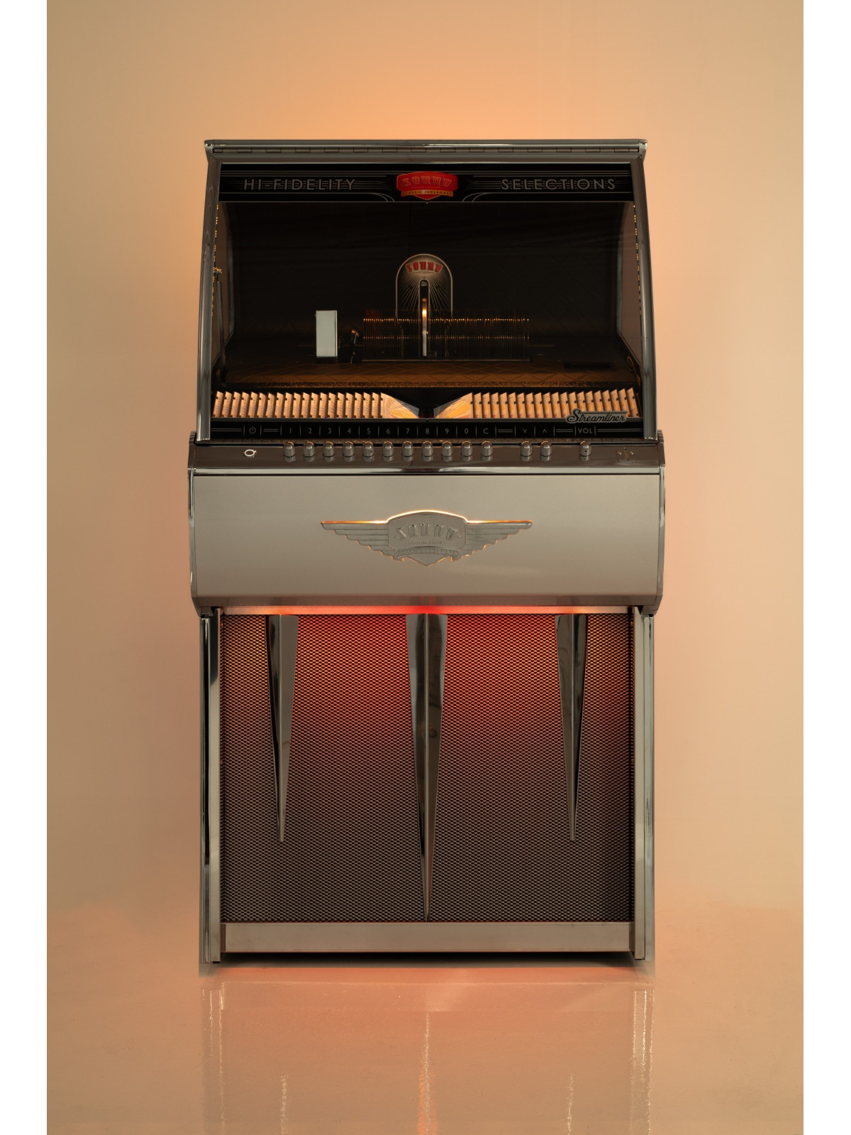 Le système audio embarqué, associé à un amplificateur dédié Sound Leisure et à des haut-parleurs de haute qualité, assure une restitution sonore puissante, claire et équilibrée. À la fois équipement audio performant et véritable objet de design, le Jukebox Streamliner Rocket CD s’adresse aux amateurs de musique, aux passionnés de design rétro revisité et aux professionnels souhaitant créer une ambiance élégante et singulière.