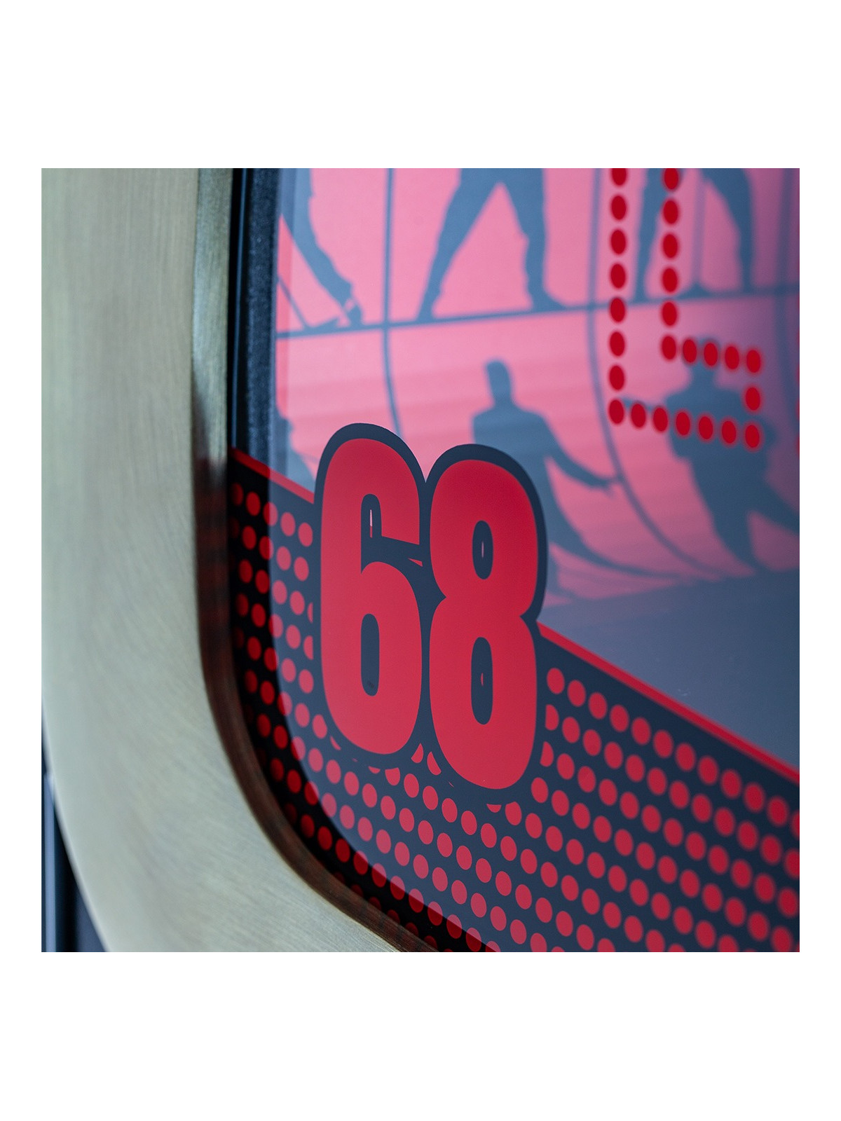 Fabriqué entièrement à la main au Royaume-Uni par Sound Leisure, ce modèle d’exception bénéficie d’un meuble en bois massif aux finitions haut de gamme, enrichi de graphismes et de détails visuels inspirés de l’esthétique iconique de 1968. Son éclairage LED intégré met en valeur ses lignes et renforce son impact visuel, faisant de ce jukebox une véritable pièce de collection.
